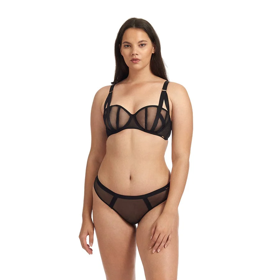Cage effect wide elastics give a bondage inspired look to this underwired balcony bra with directional gold tone hardware.